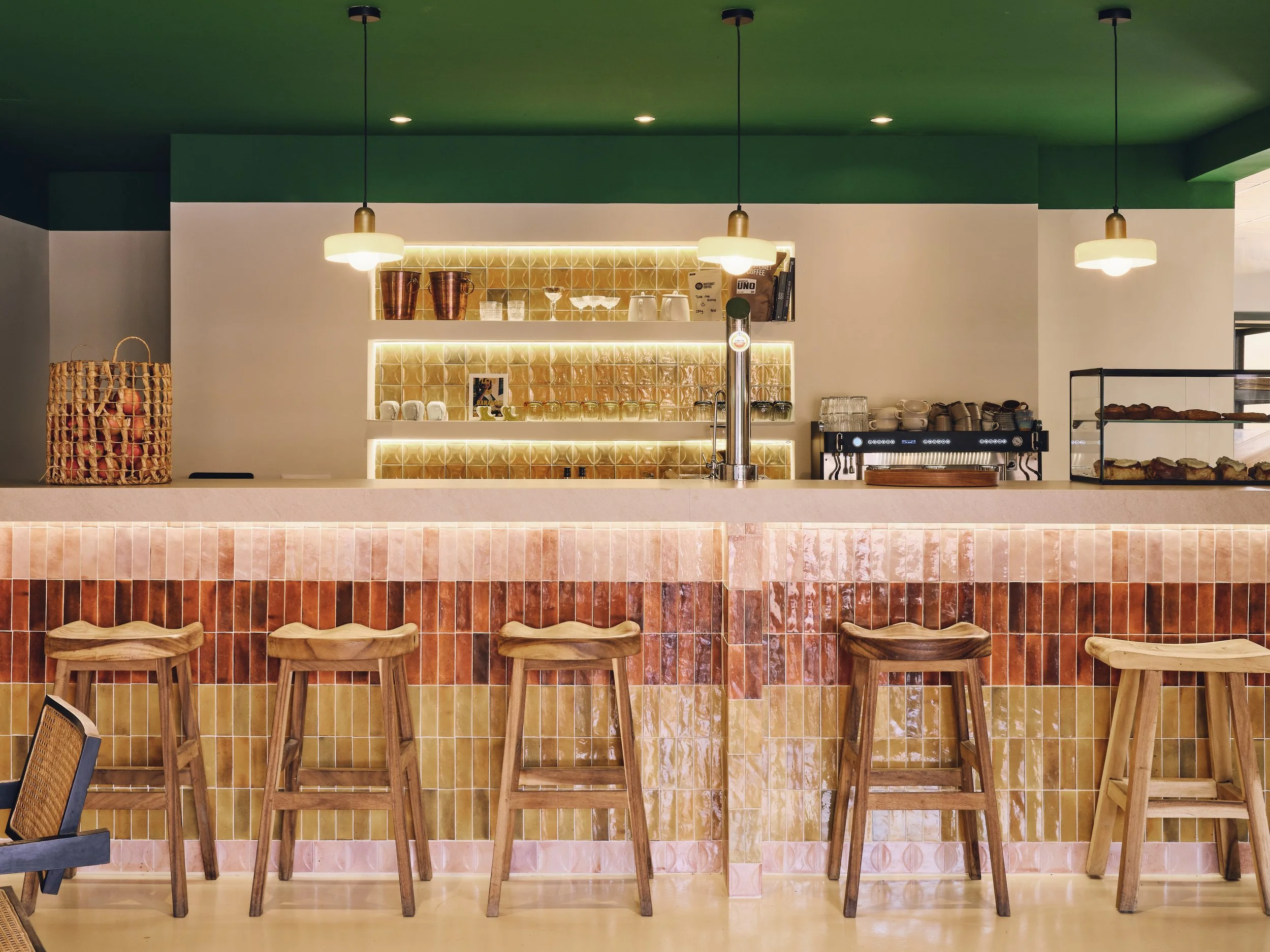 Full redesign of the space, including a custom bar and bespoke lighting. The concept blends retro tiles, bold colour contrasts and warm lighting to create a distinctive, hip and contemporary brunch restaurant in Mijas.